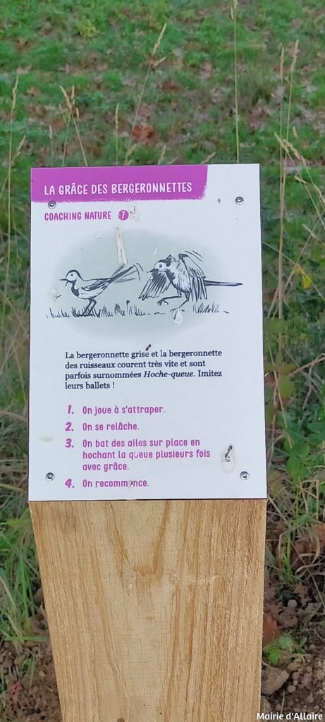 Sur chacun des 3 parkings, un panneau de Bienvenue présente le site. 19 pupitres parlent de la vie passée et actuelle de la ferme, de l’allée, des jeux, des animaux de la ferme et sauvages, des pique-niques, et 20 affichettes présentent des clins d’œil en direction des promeneurs, des amateurs de biodiversité, des pêcheurs, des sportifs …