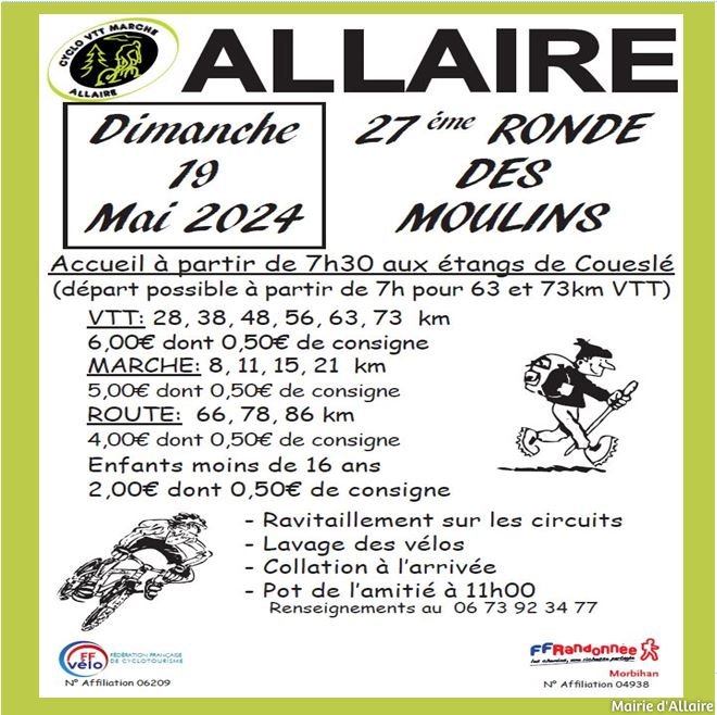 1080 inscrits pour cette nouvelle édition, qui a ravis tous les participants qui avaient le sourire, sous le soleil, à l’arrivée à la ferme de Coueslé. 637 marcheurs, 339 VTT et 104 cyclos ont pu découvrir la campagne d’Allaire et des environs, sur des circuits préparés par le club cyclos VTT, marche de la commune.