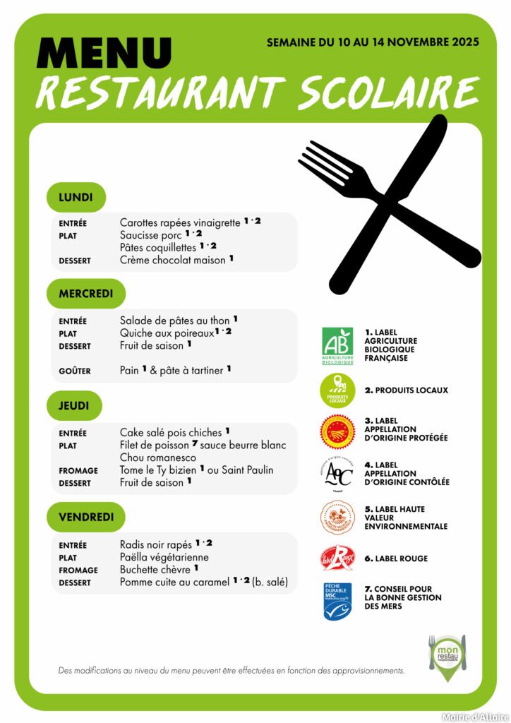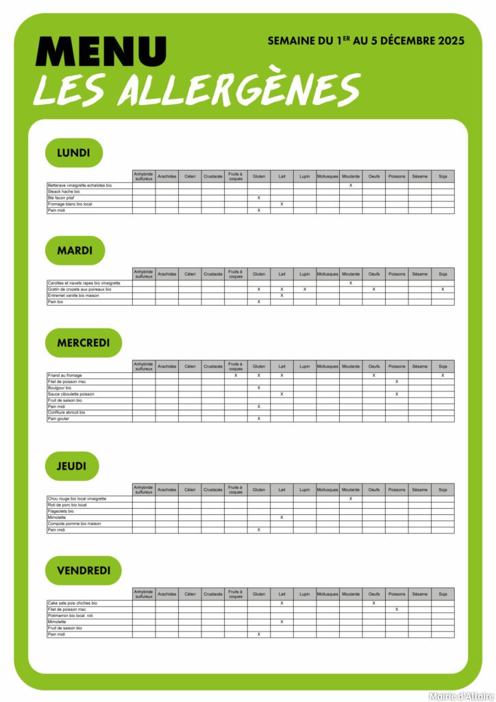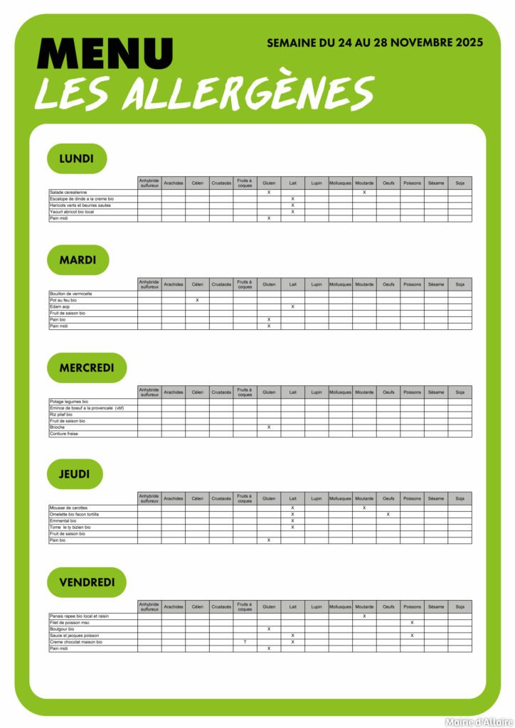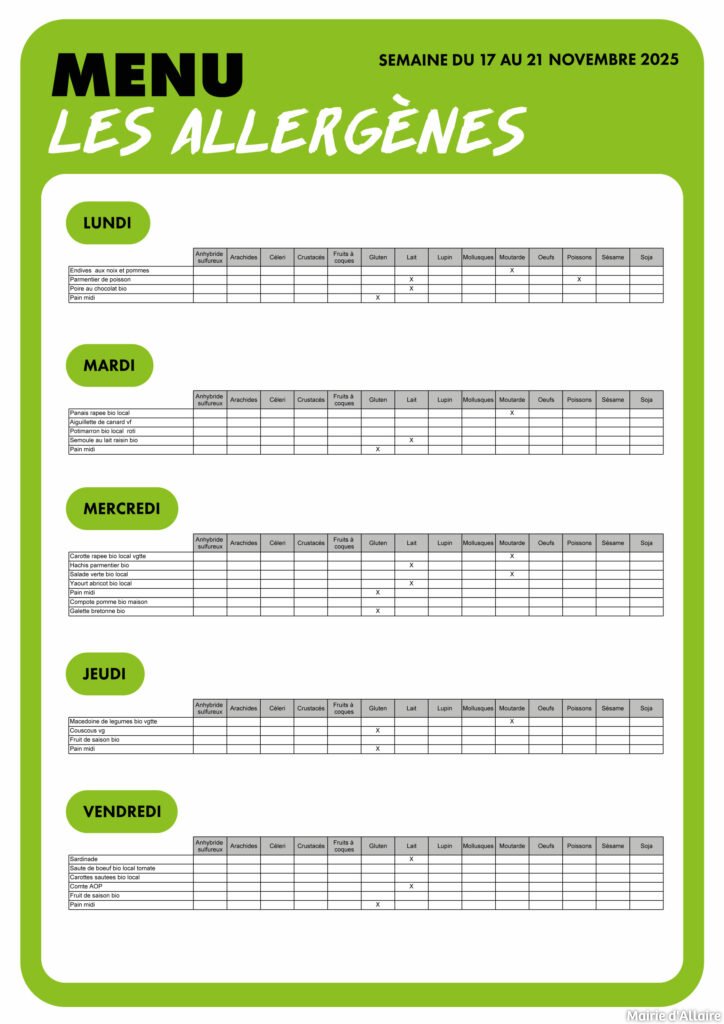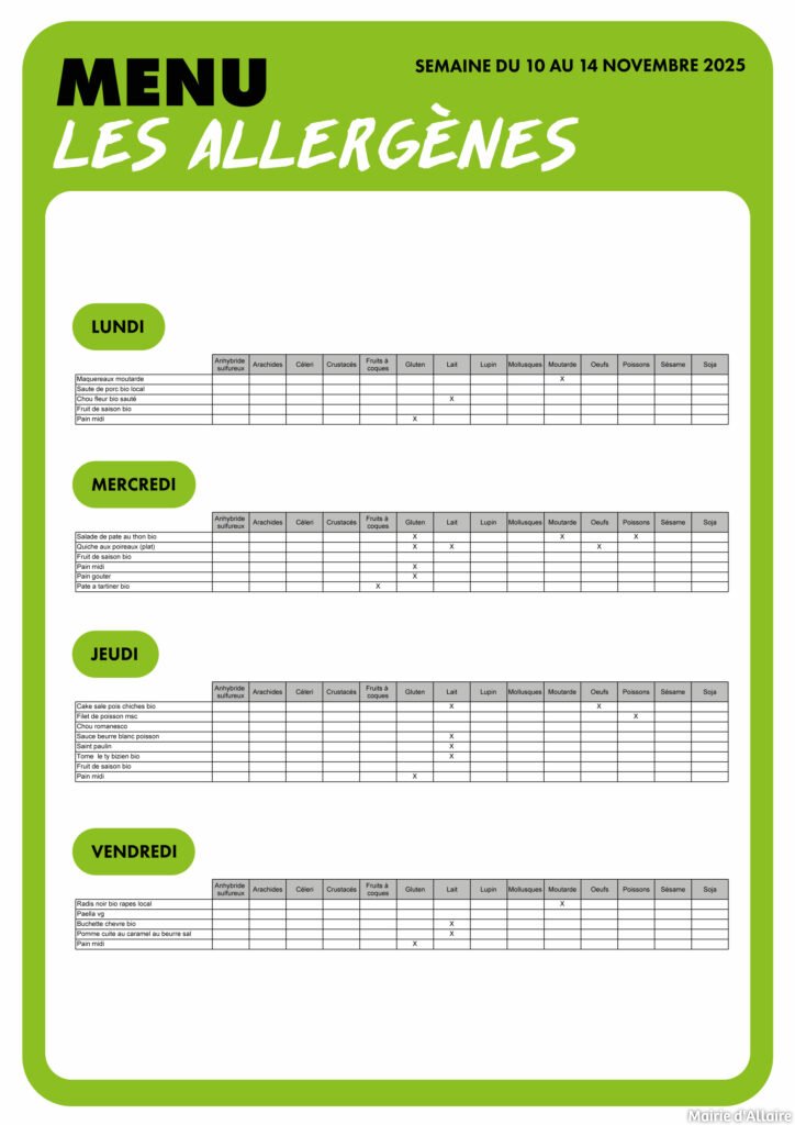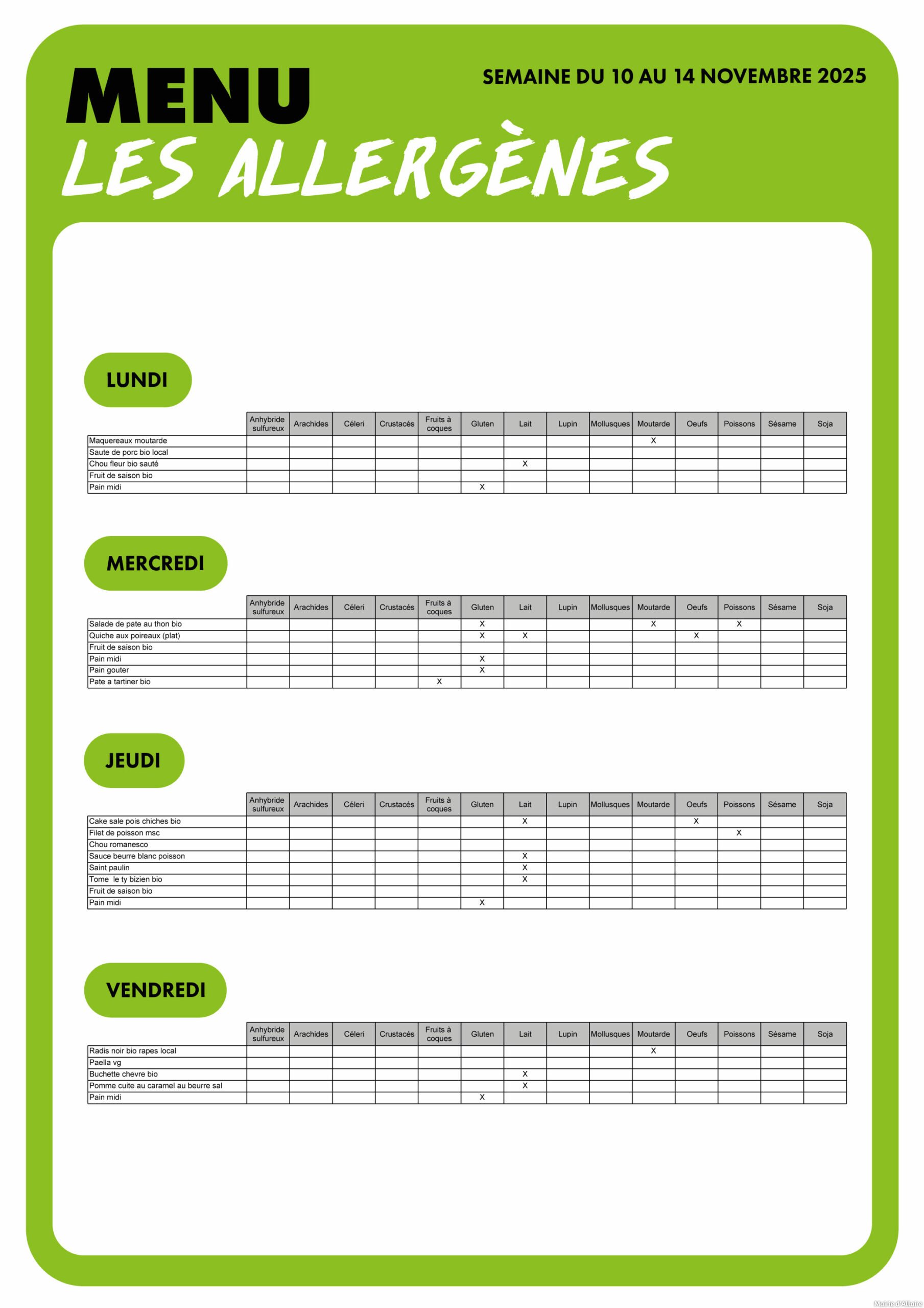 Menus et allergènes du 10 au 14 novembre & du 17 au 21 novembre