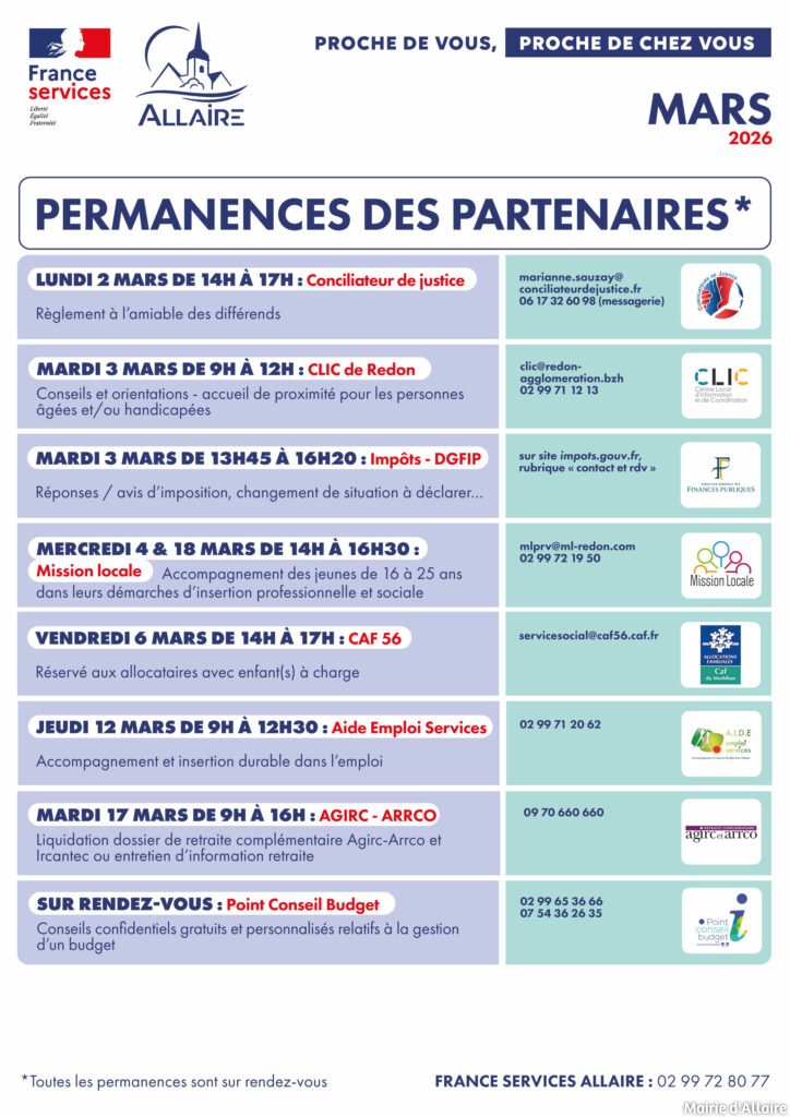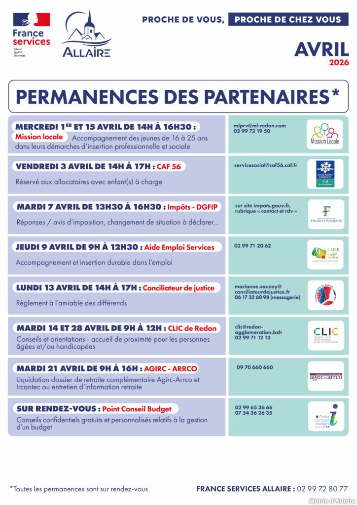 Accueil / La Mairie & vous / France Services ALLAIRE / Planning des permanences des partenaires